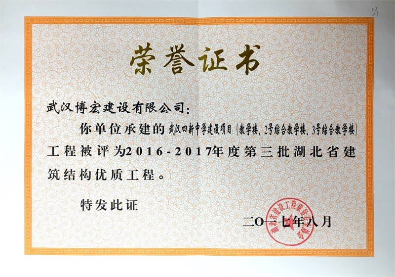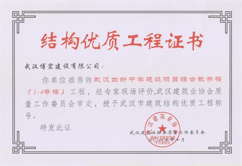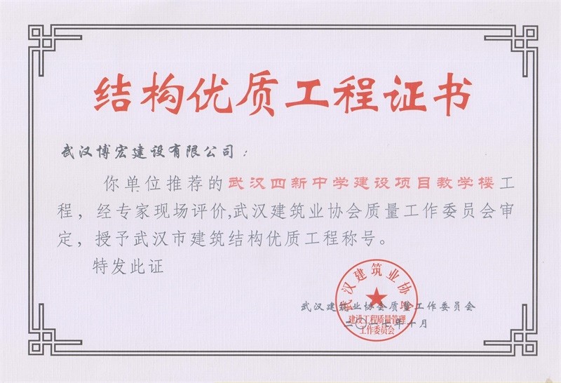 結構優質工程證書(武漢四新中學教學樓)