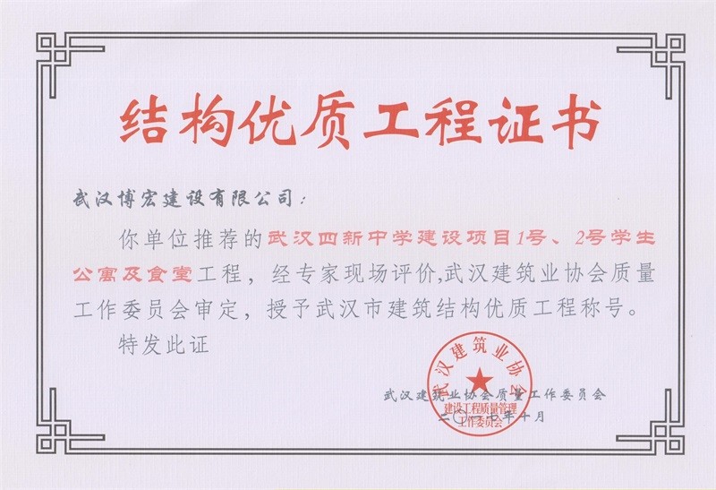結構優質工程證書(武漢四新中學綜合1號、2號學生公寓及食堂樓)