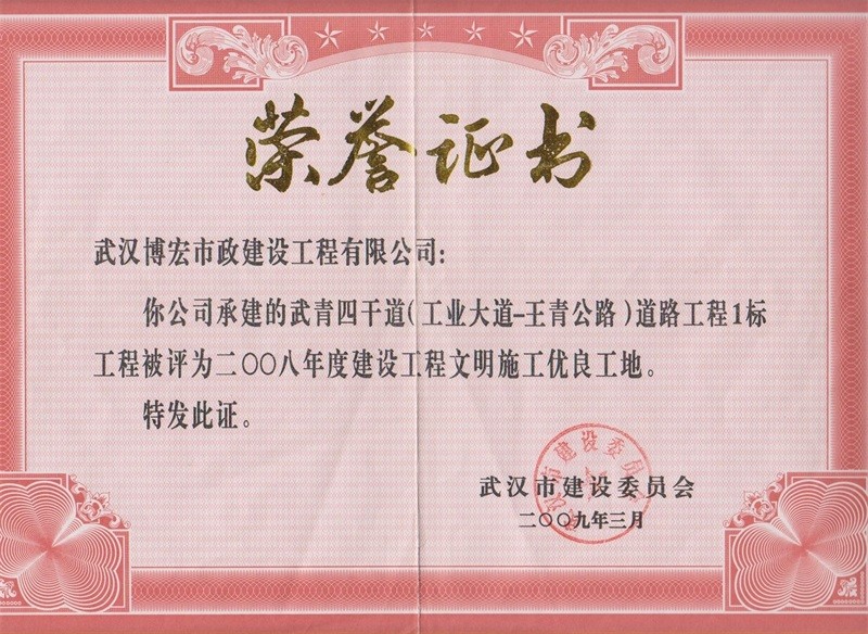 2008年度武漢市建設(shè)工程文明施工優(yōu)良工地(武青四干道道路工程一標(biāo))