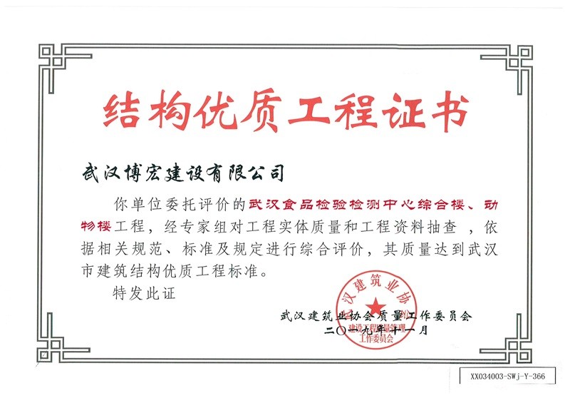 結(jié)構(gòu)優(yōu)質(zhì)工程證書(食檢中心綜合樓、動(dòng)物樓)