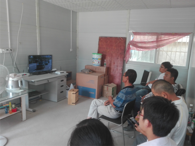項目經理王哲帶領項目部成員及農民工收看閱兵儀式