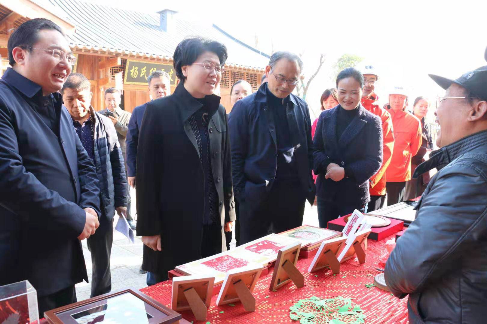 肖菊華一行走進項目現場,在項目負責人的陪同和講解下,參觀了沔陽小鎮迎客廳、商業街、云野夢田服務中心及樣板間等區域,并觀賞了沔陽傳統花鼓戲《站花墻》選段,欣賞了沔陽非物質文化遺產代表作雕花剪紙、沔陽貝雕、麥稈畫等。肖菊華在考察項目建設情況的過程中,親切地同文化傳承老藝人進行了交流,一方面肯定了老藝人們對沔陽文化的堅守,另一方面對項目整體設計和構造所呈現出來的獨特文化展示平臺表示了認可。
