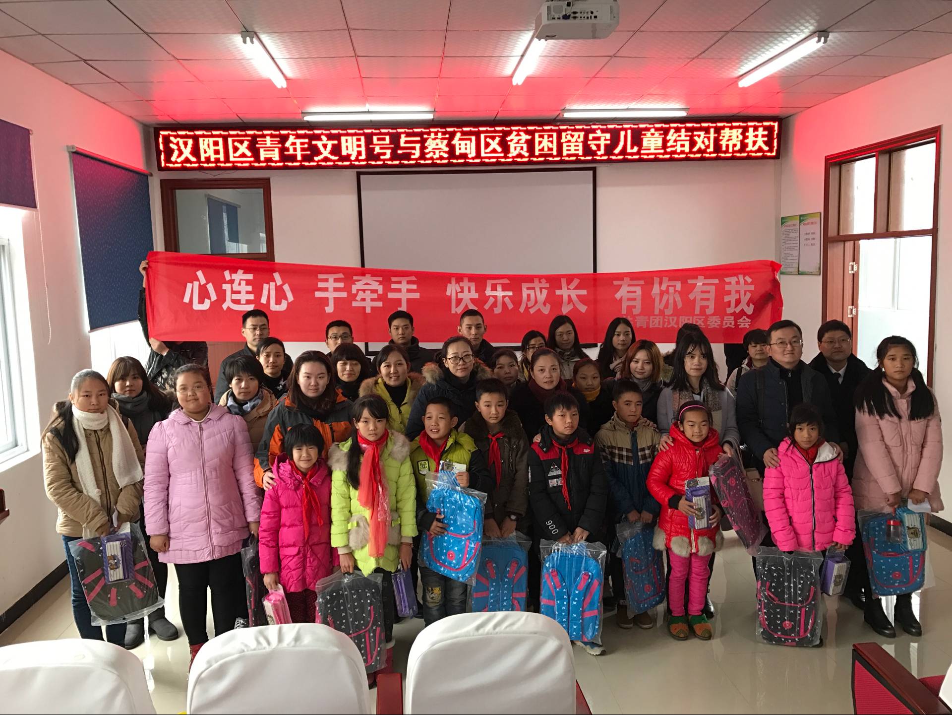 11月24日,為認(rèn)真落實(shí)共青團(tuán)助力脫貧攻堅(jiān)電視電話會(huì)議精神,根據(jù)“關(guān)愛留守兒童,助力精準(zhǔn)扶貧”行動(dòng)整體安排,漢陽(yáng)團(tuán)區(qū)委組織全區(qū)20個(gè)市級(jí)以上青年文明號(hào)單位赴蔡甸區(qū)消泗鄉(xiāng),集中慰問(wèn)幫扶貧困留守兒童,并進(jìn)行現(xiàn)場(chǎng)結(jié)對(duì),我公司參與了此次慰問(wèn)幫扶活動(dòng)。