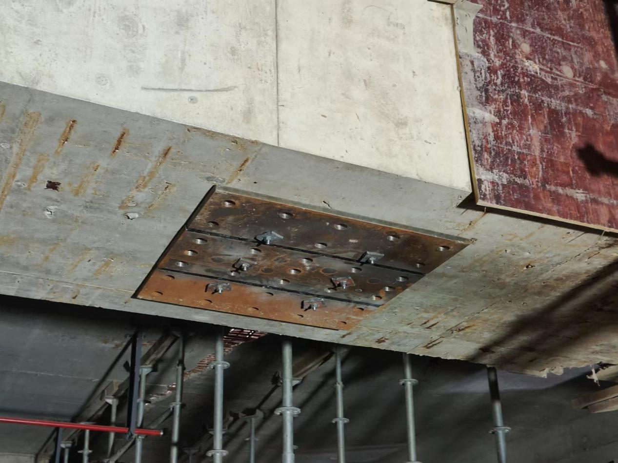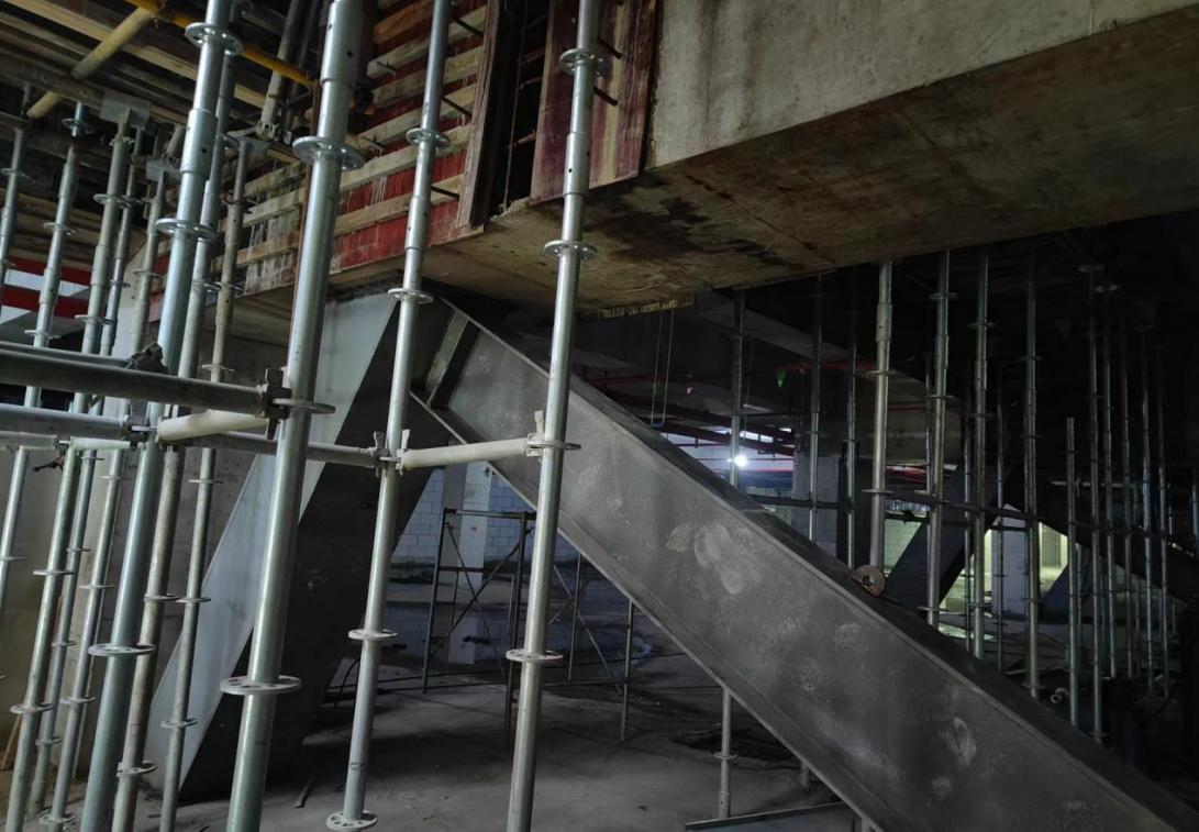 上述人字撐材料為項目副樓東側(cè)拆除懸挑鋼平臺的鋼構(gòu)件進行回收利用。施工時支撐系統(tǒng)搭拆快捷,節(jié)省了人工、鋼管扣件及架體租賃費用,有效縮短了工期。該支撐系統(tǒng)具有整體剛度大、穩(wěn)定性好、節(jié)點牢固的特點,無論是安裝、拆除都十分方便,靈活性較強,極大程度地保證了現(xiàn)場的施工安全。且待結(jié)構(gòu)完成后,人字撐支撐材料可拆卸回收周轉(zhuǎn)利用,創(chuàng)造了良好的環(huán)保、經(jīng)濟和社會效益。