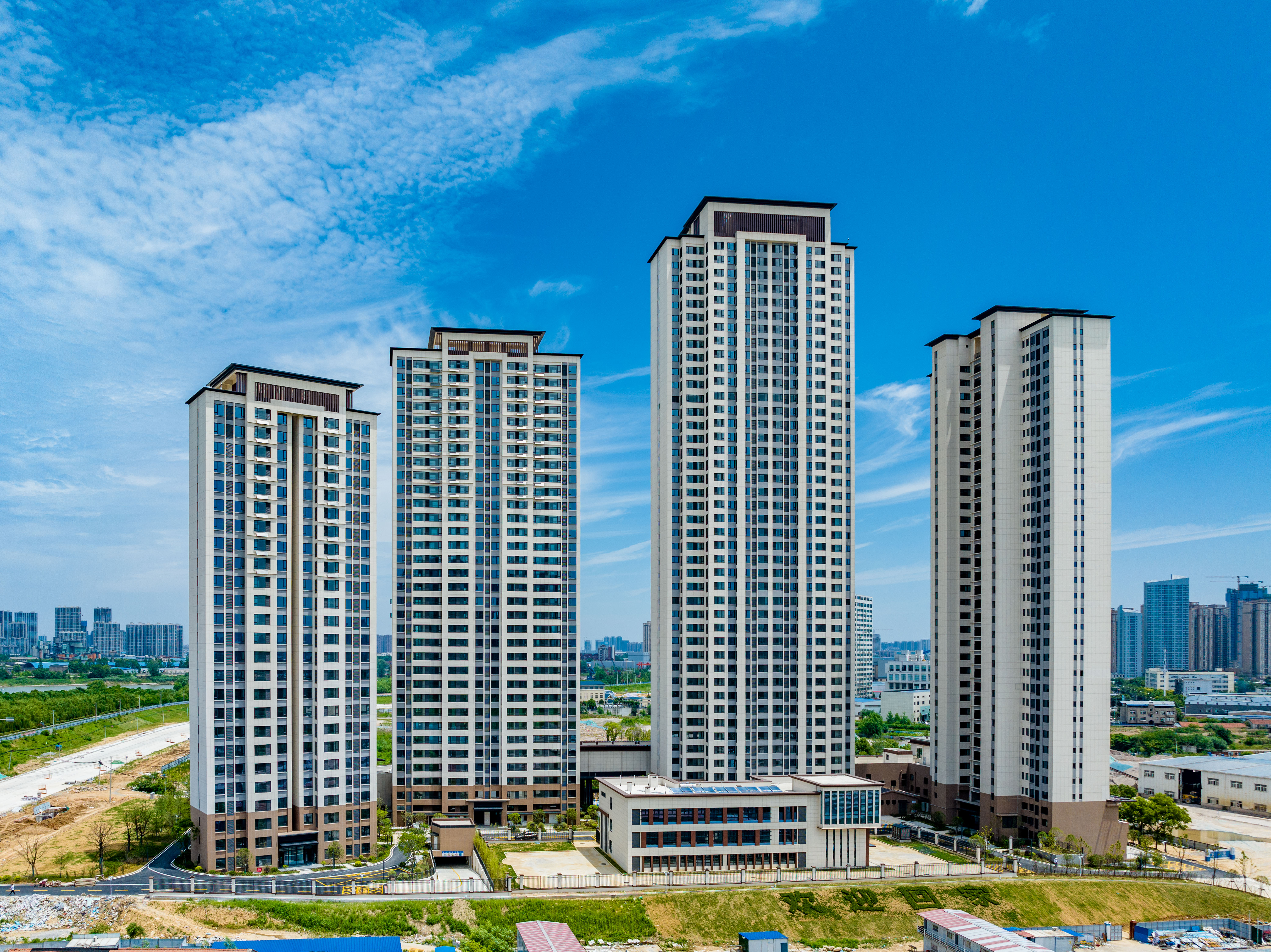 居住項目(四臺村還建房B地塊)位于湖北省武漢市漢陽區四臺三路與四臺北路交匯處以南,小區一線臨江,由1~4#樓(25層~42層高層住宅)、幼兒園(3層)組成。各棟單體由整體地下室相連,地下室為2層,局部為1層。項目建成后將有利于改善周邊居民的生活條件,提升城市功能形象品質。